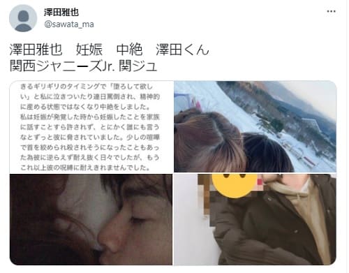 ジャニーズjrの澤田雅也さんの元カノと思われる人物が澤田雅也さんの子供を妊娠して最終的に中絶したと告発はして話題になっています。告発した元カノによると一度は育てる話になったものの中絶ができるギリギリの週になって堕ろして欲…